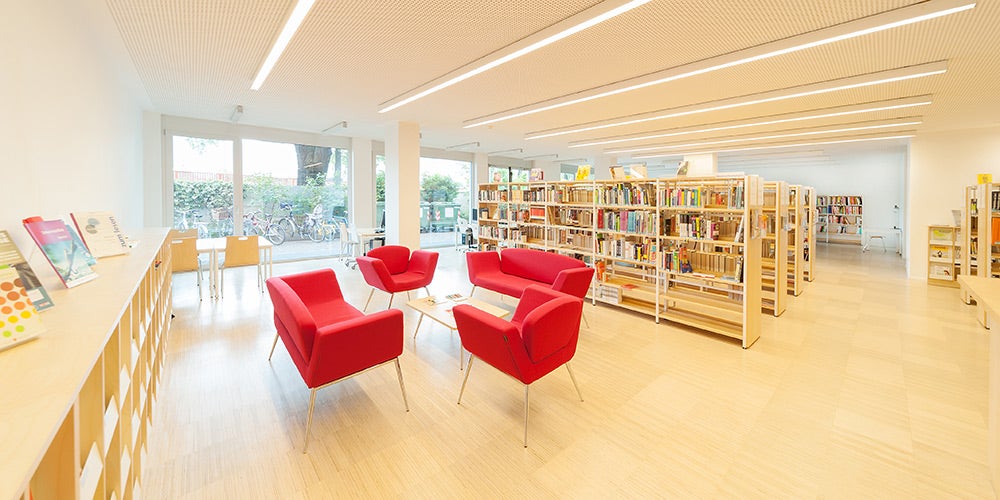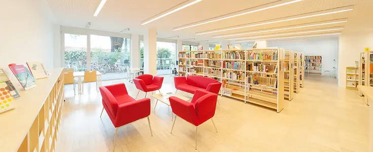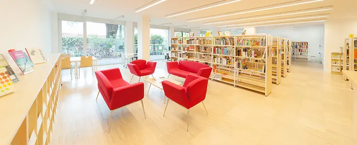 Im Erdgeschoss befindet sich unsere Bibliothek, die neben Belletristik und Sach- und Fachliteratur auch Zeitungen und Zeitschriften anbietet.