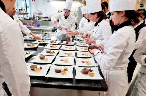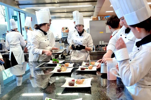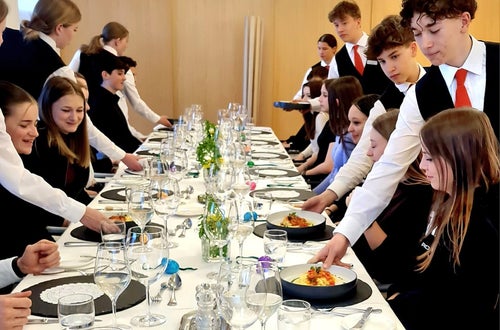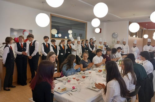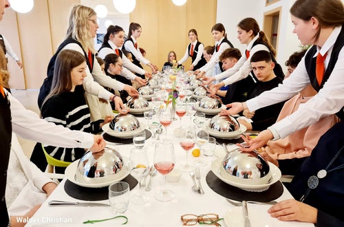 Frau Ambrosini und Frau Abraham, beide unterrichten das Fach Beherbergung, gaben den Teilnehmern einen dreistündigen Einblick in die Welt des guten Benehmens. Die Schülerinnen und Schüler hatten im Restaurant der Hotelfachschule die Gelegenheit, bei einem erstklassigen Drei-Gänge-Menü zu erfahren, wie man sich in einem Restaurant angemessen verhält. Die Schülerinnen und Schüler der 2A HOFA-Klasse Reinhold Hofmann (Küche) und Christian Walder (Service) bereiteten "besonders" anspruchsvolle Gerichte zu, die volle Aufmerksamkeit von den Gästen erforderten.