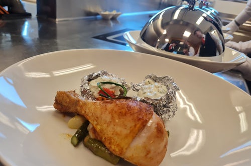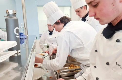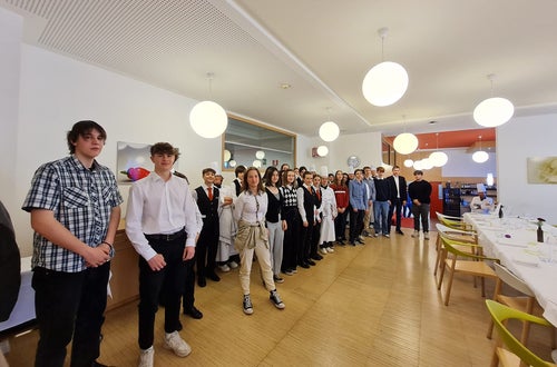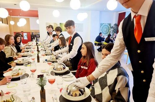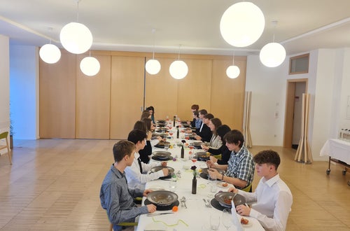 In den Wochen nach der theoretischen Einführung durften die Schüler:innen das Erlernte in die Praxis umsetzten. Mittagessen an der Hotelfachschule mit schwierigen Gerichten. Darunter Bandnudel mit Tomatensoße und Hühnchen am Knochen. Wohin mit der Serviette? Stößt man mit einem Weinglas an? Handy am Tisch? Diese und viele weitere Fragen wurden bei einem leckeren Mittagessen geklärt.