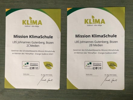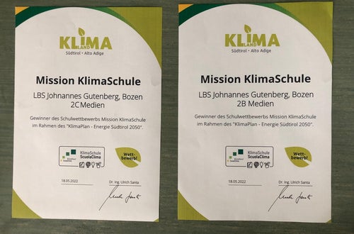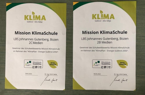 Die beiden Klassen 2B und 2C Medien konnten bei dem Südtirol weiten Wettbewerb „Mission KlimaSchule“, organisiert von der KlimaHaus Agentur Südtirol, in der Kategorie „Oberschule“ für sich entscheiden! Die Broschüren „7 Tage 7 Tipps für den täglichen Klimaschutz“ konnten sowohl grafisch als auch inhaltlich die Jury überzeugen.